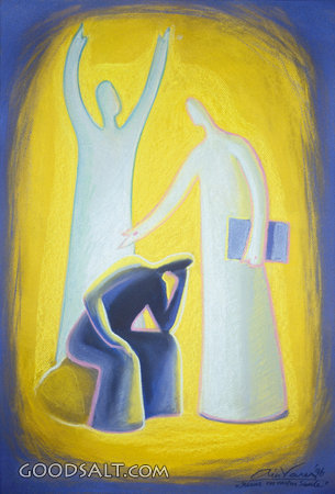 praise, giving praise, hands raised, jesus and man, man witnesses, 3 men, man sitting