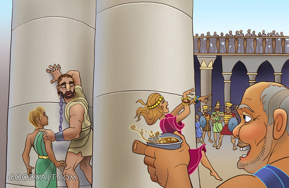 captive, between, temple, mock, philistine, cartoon, samson, pillars