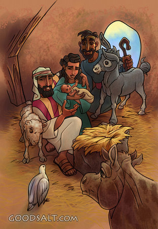 born, nativity, Jesus, birth, shepherd, joseph, mary, manger, cartoon, christmas, stable, animals