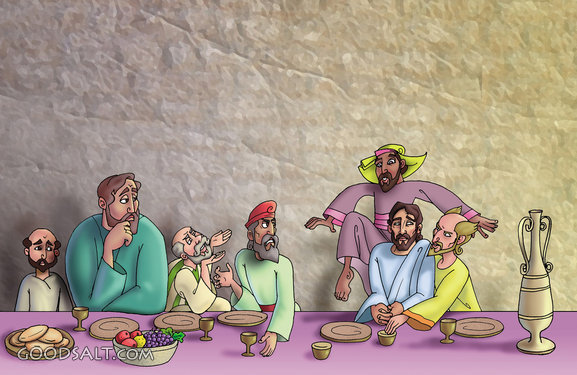Jesus, dip, judas, meal, cartoon, last, supper, disciples