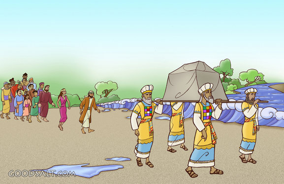 ground, dry, miracle, priest, jordan, river, ark, cartoon, carry