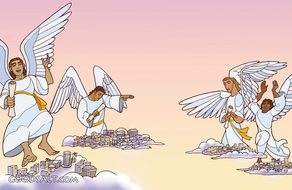 angel, cities, prophecy, seven, cartoon, clouds, churches