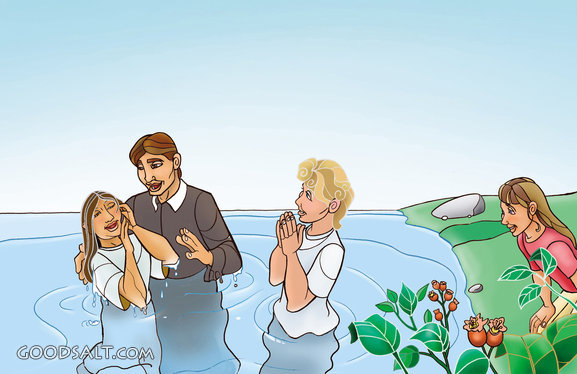 baptized, water, baptism, lake, pastor, woman, river, cartoon