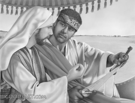 Philip and the Ethiopian Acts 8:26-40 teach, learn, read, reading, bible, men, teacher, african, ethiopian, jerusalem, philip, israel, eunuch, traveling, characters, black and white PROJECTION - License for PowerPoint™ PRINT – buy a print of this picture; optional frame Bible Hub |