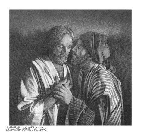 Judas Betraying Christ Luke 22:48 greet, christ, betrayed, kiss, kissed, sold, greeting, betrayal, stories, testament, teacher, new, night, of, easter, passion, the, characters PROJECTION - License for PowerPoint™ PRINT – buy a print of this picture; optional frame Bible Hub |