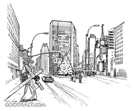 city, carrying, christ, Jesus, street, cross, easter, passion, crucifixion, buildings, skyscrapers