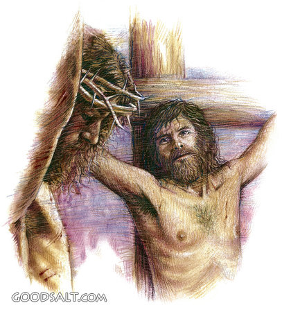 One of Two Thieves Speaks to Jesus From the Cross Luke 23 character, lord, master, messiah, salvation, crucifix, agony, pain, calvary, suffering, sadness, crucified, dead, christ, Jesus, talking, nailed, nailing, thorn, sorrow, redeem, jew, emmanuel, immanuel, penalty, man, men, teacher, crown, blood, lamb, believing, shame, dying, nail, superscription, pierced, sacrificial, death, savior, cross, thief, sin, reconciliation, forgiveness, sacrifice, offering, easter, passion, crucifixion, crucify, redemption, passion week PROJECTION - License for PowerPoint™ PRINT – buy a print of this picture; optional frame Bible Hub |