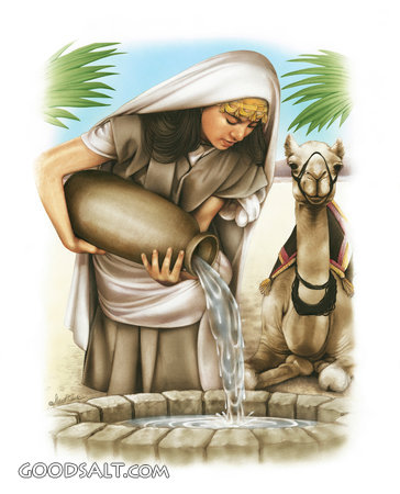 Rebeka at the Well Genesis 24 test, water, pouring, pour, animal, girl, woman, person, isaac, watering, wife, female, jug, pitcher, well, camel, servant, rachel, rebekah, draws, nahor PROJECTION - License for PowerPoint™ PRINT – buy a print of this picture; optional frame Bible Hub |