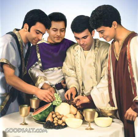 The Healthy Diet of Daniel Daniel 1 choose, banquet, diet, healthy, table, eating, vegetable, men, food, three, feast, meal, daniel, abednego, meshach, shadrach, nebuchadnezzar, friend, male, witness, fruit, court, cup, dinner, goblet, hananiah, mishael, azariah, friends, vegan PROJECTION - License for PowerPoint™ PRINT – buy a print of this picture; optional frame Bible Hub |