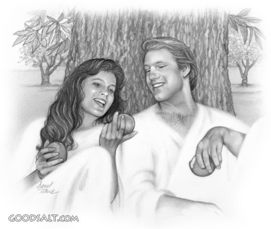 angel, people, eating, couple, woman, man, heaven, tree, male, female, apple, fruit