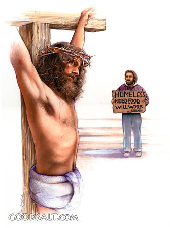 Jesus on a Cross With Homeless Man in Background