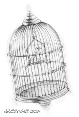 inside, bird, perched, birdcage, pet, darrel tank, black and white, canary