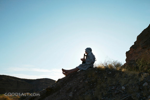 sky, israelite, costume, hillside, rock, boy, man, sitting, sit, headdress, silhouette