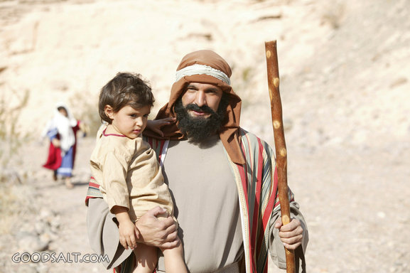 standing, holding, father, israelite, costume, child, hand, staff, son, pole, smile, smiling, headdress, stand