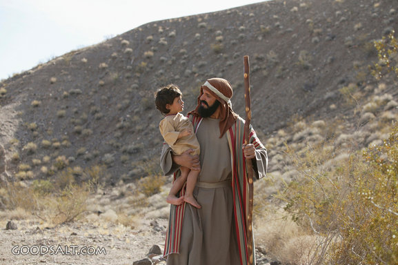 walk, holding, father, israelite, costume, caring, hillside, care, loving, son, stick, love