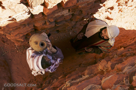 israelite, lighting, overhead, stone, woman, man, wall, wife, husband, jug, pitcher