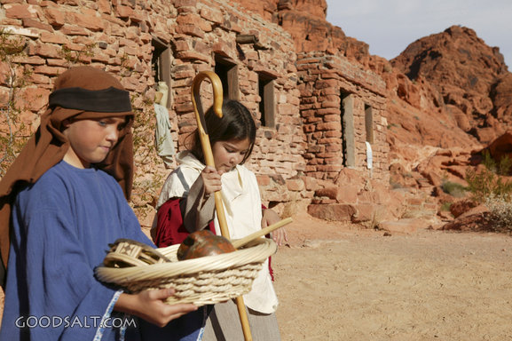 walk, israelite, costume, cane, closeup, stone, girl, boy, staff, wall, basket, headdress, brick, children