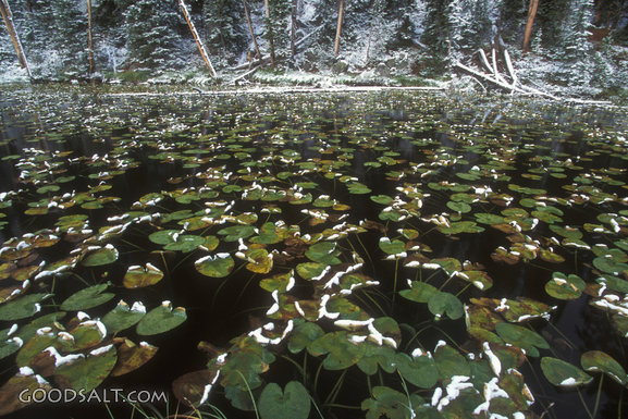 water, pond, green, white, snow, plants, lily pad