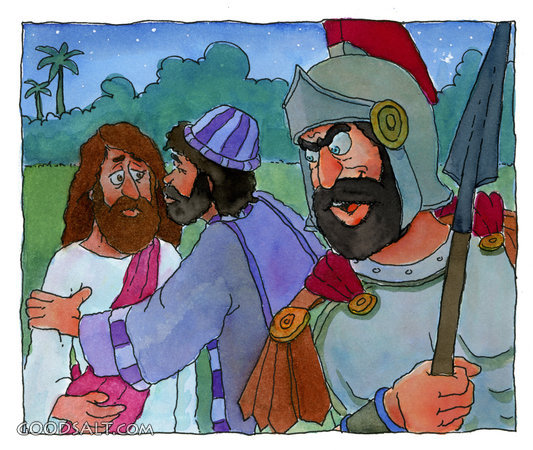 Judas Betrays Jesus Mark 14:43-52 signal, kiss, betrayal, betray, disciple, judas, soldier, gethsemane, garden, garden of gethsemane, hochstatter, daniel j. hochstatter PROJECTION - License for PowerPoint™ PRINT – buy a print of this picture; optional frame Bible Hub |