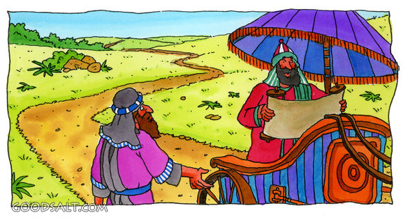 Philip and the Ethiopian Eunuch Acts 8:27-30 reading, philip, chariot, carriage, reading scripture, hochstatter, daniel j. hochstatter, ethopian, explains scripture PROJECTION - License for PowerPoint™ PRINT – buy a print of this picture; optional frame Bible Hub |