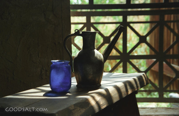 Pitcher Still Life Proverbs 25:25 Matthew 10:42 table, morning, daytime, shadow, blue, pitcher, window, cup, shadows, still life, frank gampel, wrought iron PROJECTION - License for PowerPoint™ PRINT – buy a print of this picture; optional frame Bible Hub |