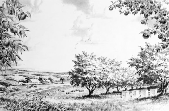 drawing, farm, orchard, fruit, trees, vintage