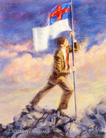 Man Planting Christian Flag 2 Timothy 2:3-4 1 Peter 2:11-12 symbolism, rocky, running, holding, run, cloudy, outside, clouded, intently, earnestness, earnestly, stone, important, importance, dressed, dressy, intensely, intenseness, anchor, anchoring, outdoor, white, rock, cloud, earnest, man, symbol, flag, blue, suit, businessman, cross, intent, male, up, red, hold PROJECTION - License for PowerPoint™ PRINT – buy a print of this picture; optional frame Bible Hub |