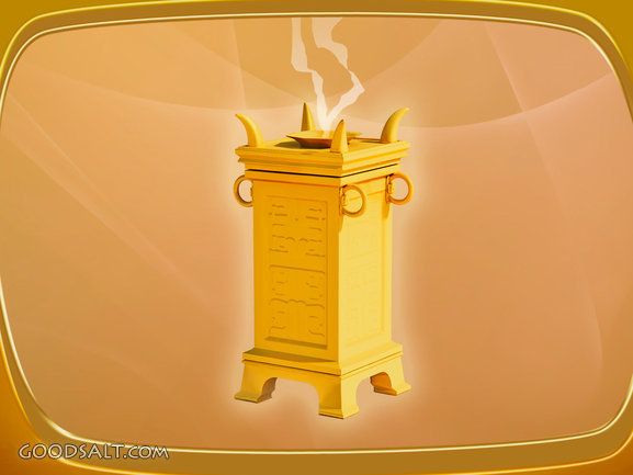 Altar of Incense Exodus 30:1 Exodus 31:8 Exodus 35:15 Exodus 37:25 Exodus 39:38 Exodus 40:5 1 Chronicles 28:18 Revelation 8:3 Luke 1:11 symbolism, atonement, atone, prayer, symbol, smoke, altar, incense, supplicant, pleasing, gold, golden, fragrance, tabernacle, symbolic, burnt offering, symbols, prayers, horns, blueprints, blueprint, most holy place, supplicate, holy place, day of atonement, supplications, altar of incense, holy of holies, continual burning, continual, rom PROJECTION - License for PowerPoint™ PRINT – buy a print of this picture; optional frame Bible Hub |