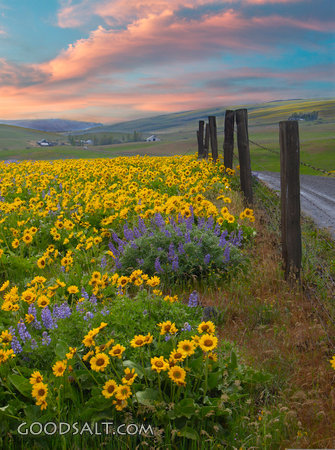 countryside, sunset, farm, wild, fence, wildflowers, flowers