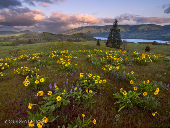 mountain, river, evening, wild, meadow, wildflowers, flowers, clouda