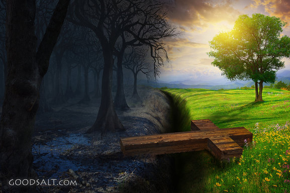 Crossing the Gap John 5:24 John 10:18 John 3:16 surreal, sun, landscape, sky, god, nature, Jesus, spring, cliff, chasm, old, sunset, field, life, new, death, cross, religion, christian, bridge, fog, concept, forest, meadow, woods, trees, mountains, clouds, colors, flowers PROJECTION - License for PowerPoint™ PRINT – buy a print of this picture; optional frame Bible Hub |