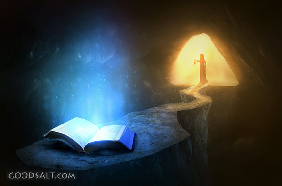 surreal, glow, seek, dark, bible, book, find, woman, path, blue, light, christian, search, cave, scripture