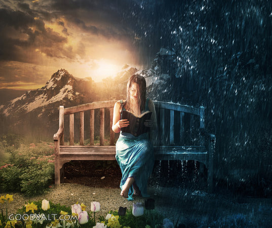 Woman Reading in Sun or Rain Joshua 1:8 Psalm 1:2 surreal, study, water, bench, wet, sky, dry, read, weather, bible, book, peace, girl, woman, sunset, storm, garden, rain, concept, distraction, female, flowers, christain PROJECTION - License for PowerPoint™ PRINT – buy a print of this picture; optional frame Bible Hub |