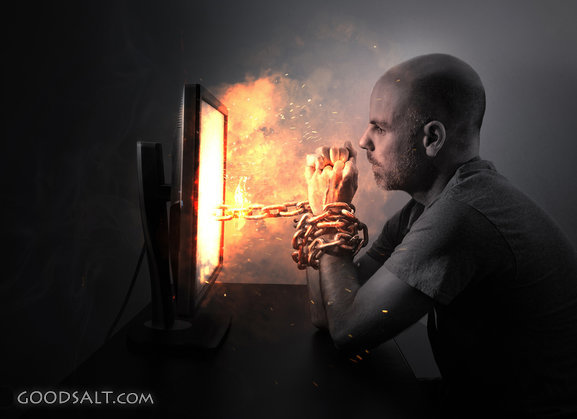 Chained to Flaming Computer Proverbs 7:24-27 surreal, pain, computer, flame, dark, chain, addiction, screen, technology, man, alone, trapped, fire, prison, internet, slave PROJECTION - License for PowerPoint™ PRINT – buy a print of this picture; optional frame Bible Hub |