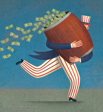 Uncle Sam Running With Barrel of Money