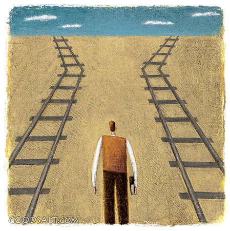 Man Standing between Two Railroad Tracks Going in Opposite D Proverbs 3:6 choose, walk, choice, bible, decide, decision, direction, path, faith, doctrine, difference, barrie, differ, diverge, tracks PROJECTION - License for PowerPoint™ PRINT – buy a print of this picture; optional frame Bible Hub |