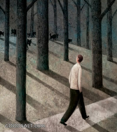 Man in Dark Forest With Wolves Matthew 10:16 Luke 10:3 safety, attack, attacking, prey, danger, hunt, hunting, path, faith, protection, forest, wolf, pack, preying, barrie, wolves PROJECTION - License for PowerPoint™ PRINT – buy a print of this picture; optional frame Bible Hub |