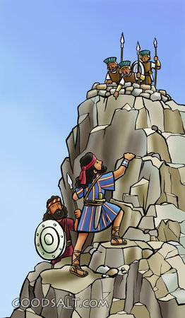 Jonathan Climbs the Mountain 1 Samuel 14:13 climb, climbing, attack, ridge, mountain, spear, shield, simple, army, armor, soldiers, watchmen, whimsical, line drawing, childrens illustration, childrens art, line art, armor bearer, climbs, ksjas0023, sunday school, sabbath school PROJECTION - License for PowerPoint™ PRINT – buy a print of this picture; optional frame Bible Hub |