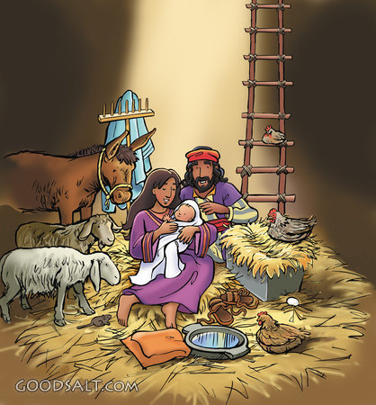 Nativity Luke 2:7 inside, nativity, baby, barn, joseph, mary, sheep, hay, manger, straw, ladder, cartoon, simple, christmas, stable, donkey, animals, christmas story, whimsical, line drawing, childrens illustration, childrens art, ink line style, mary holds baby, mary holds baby jesus, ksjas0027, beam of light PROJECTION - License for PowerPoint™ PRINT – buy a print of this picture; optional frame Bible Hub |
