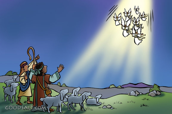 Shepherd Song Luke 2:13 sing, hillside, beam, surprise, sheep, light, cartoon, song, flock, christmas, announcing, angels, shepherds, looking up, christmas story PROJECTION - License for PowerPoint™ PRINT – buy a print of this picture; optional frame Bible Hub |