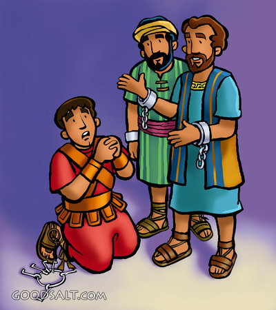 What Must I Do to Be Saved? Acts 16:25-34 Acts 16:30 salvation, illustration, colourful, style, paul, prison, cartoon, jailer, macedonia, silas, romans, Macedonian, Kindergarten, Primary, paul and silas, whimsical, childrens style, line drawing, kim justinen, childrens art, line art, heavy ink line, cartoon illustration, color and line, colour and line, cradle roll, ksjas0040, 0040, what must i do to be saved, paul & silas, prisioners, keeper of the prison, airbrushed, heavy line style, ink brush style, cartoon style, roman jailer PROJECTION - License for PowerPoint™ PRINT – buy a print of this picture; optional frame Bible Hub |