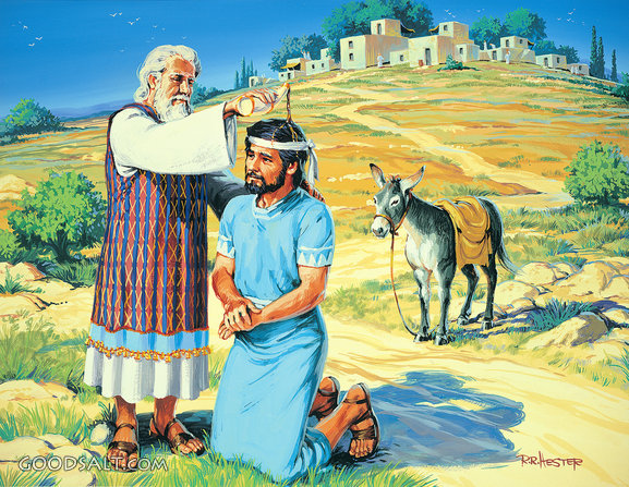 Samuel Anoints Saul 1 Samuel 10:1 standing, small, collection, head, samuel, saul, town, king, oil, of, edge, anointing, bottle, donkey, olive, on, kneels, Anoints, it, lifeway, ron hester, poured, lfwas0182 PROJECTION - License for PowerPoint™ PRINT – buy a print of this picture; optional frame Bible Hub |