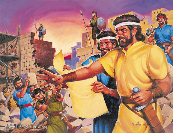 Nehemiah Works on the Wall Nehemiah 3:16 Nehemiah 2:17 Nehemiah 4:15-18 carrying, build, collection, men, jerusalem, hand, wall, rebuild, nehemiah, sword, on, stones, works, repair, lifeway, r. hester, sentries, lfwas0189 PROJECTION - License for PowerPoint™ PRINT – buy a print of this picture; optional frame Bible Hub |