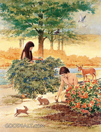 Jobs to Do for Adam and Eve Genesis 1:28-29 job, collection, adam, eve, garden, eden, trees, animals, birds, lifeway, karch art studio, lfwas0252, dieer, rabbits. PROJECTION - License for PowerPoint™ PRINT – buy a print of this picture; optional frame Bible Hub |