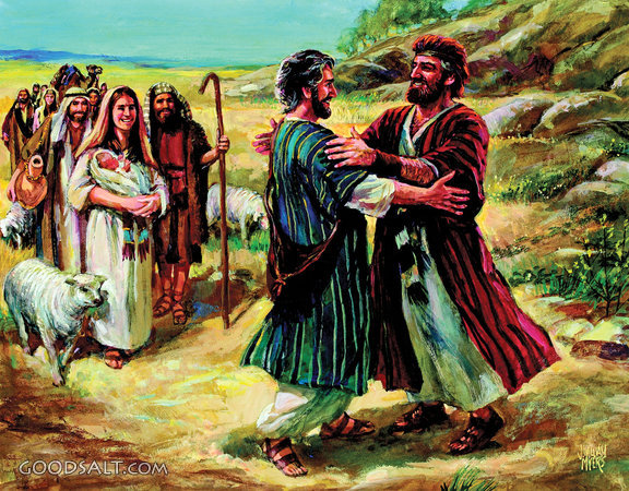 Jacob and Esau Reunite Genesis 33:1-4 collection, families, reunite, family, parted, jacob, embrace, esau, brothers, reunion, lifeway, j. william myers, lfwas0508 PROJECTION - License for PowerPoint™ PRINT – buy a print of this picture; optional frame Bible Hub |