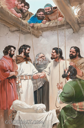 Four Friends Who Helped Mark 2:1-12 down, Jesus, heal, lower, crippled, collection, four, tear, lame, open, roof, friends, tore, Helped, lifeway, angus mcbride PROJECTION - License for PowerPoint™ PRINT – buy a print of this picture; optional frame Bible Hub |