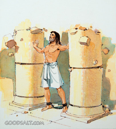 Samson Destroys Philistine Building Judges 16:26-30 standing, touching, outstretched, collection, between, crumbling, medium, building, hair, samson, arms, columns, poles, tipping, Length, Crumbled, lifeway, ifwas2229 PROJECTION - License for PowerPoint™ PRINT – buy a print of this picture; optional frame Bible Hub |