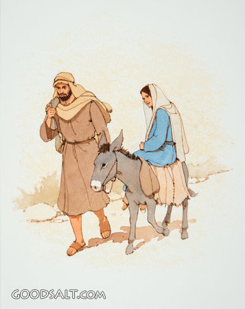 Mary and Joseph Travel to Bethlehem Luke 2:1-5 leading, shoulder, over, collection, joseph, mary, bag, donkey, walking, sits, lifeway, lfwas2243, sidesaddle, bside PROJECTION - License for PowerPoint™ PRINT – buy a print of this picture; optional frame Bible Hub |