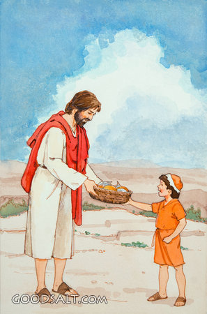 Boy Gives Jesus His Loaves and Fishes Matthew 14:15-21 twelve, two, christ, Jesus, feed, over, collection, broke, boy, bread, basket, fish, five, 5000, up, loaves, left, hands, to, disciples, baskets, it, lifeway, lf2304 PROJECTION - License for PowerPoint™ PRINT – buy a print of this picture; optional frame Bible Hub |