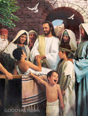 Jesus Healing a Young Boy Luke 7:11-16 happiness, joyful, happy, people, joy, walk, lift, dead, bird, christ, Jesus, heal, healing, healer, sick, miracle, procession, funeral, restore, relative, live, dove, girl, child, boy, man, men, women, widow, gift, person, shock, surprise, nain, resurrect, life, amaze, amazement, amazing, gratitude, thankfulness, ministry, town, street, faith, crowd, death, resurrected, healed, alive, son, friend, group, family, mother, male, female, parent, resurrection, luke, children, hold hands PROJECTION - License for PowerPoint™ PRINT – buy a print of this picture; optional frame Bible Hub |